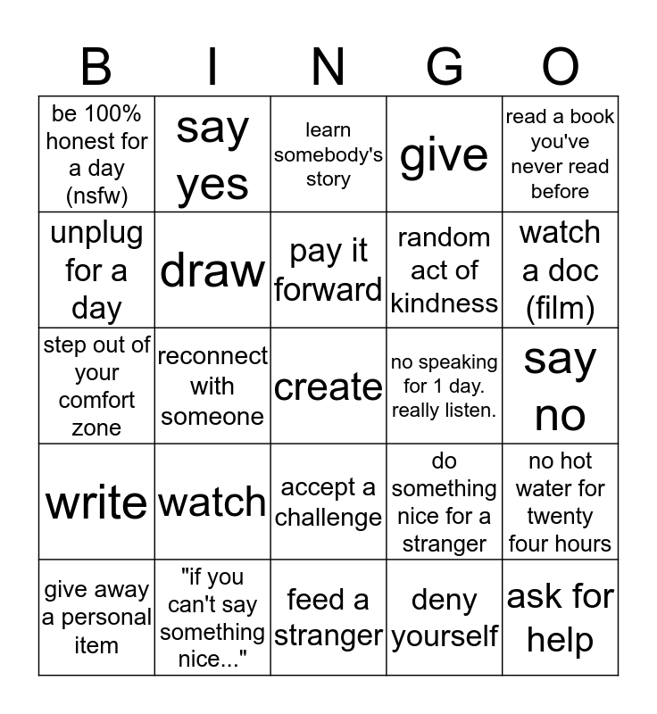 This bingo card has 25 words: watch, feed a stranger, pay it forward, give away a personal item, read a book you've never read before, be 100% honest for a day (nsfw), unplug for a day, say yes, no speaking for 1 day. really listen., accept a challenge, random act of kindness, step out of your comfort zone, do something nice for a stranger, no hot water for twenty four hours, draw, ask for help, say no, learn somebody's story, watch a doc (film), reconnect with someone, create, "if you can't say something nice...", write, give and deny yourself.
