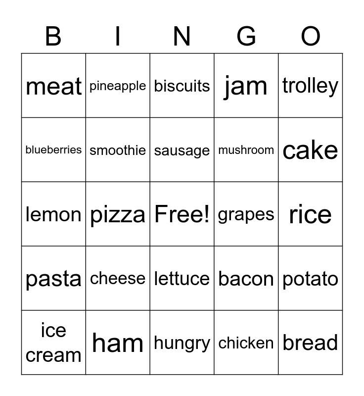 This bingo card has a free space and 24 words: cheese, ham, sausage, ice cream, trolley, meat, blueberries, pineapple, grapes, lettuce, mushroom, lemon, bacon, potato, smoothie, chicken, rice, biscuits, cake, pizza, bread, pasta, jam and hungry.