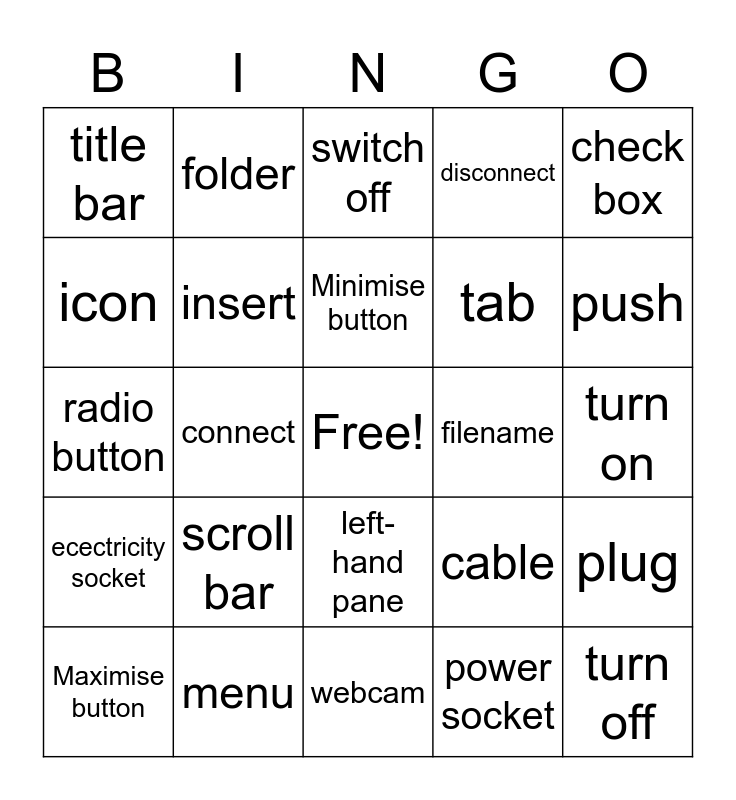 This bingo card has a free space and 24 words: scroll bar, menu, Minimise button, Maximise button, check box, title bar, icon, folder, filename, left-hand pane, tab, radio button, cable, plug, insert, power socket, turn on, switch off, push, connect, turn off, ecectricity socket, disconnect and webcam.