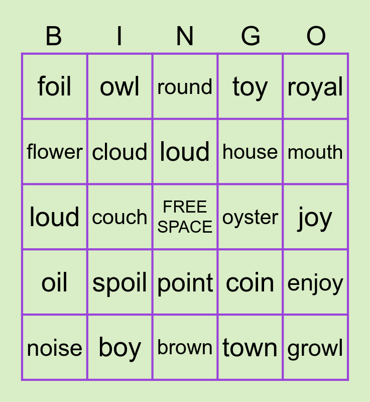This bingo card has a free space and 24 words: spoil, boy, loud, noise, royal, foil, flower, owl, oyster, point, house, loud, coin, enjoy, cloud, town, joy, round, mouth, couch, growl, oil, toy and brown.