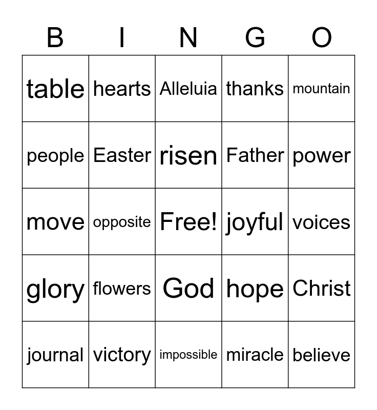 This bingo card has a free space and 29 words: journal, Norris, opposite, pandemic, table, Alleluia, Easter, flowers, joyful, victory, voices, believe, impossible, miracle, power, unbreakable, God, glory, mountain, move, hope, trust, Father, people, thanks, hearts, Christ, risen and holy.
