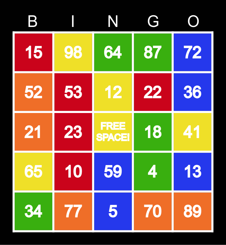 This bingo card has a free space and 24 words: 10, 77, 12, 34, 72, 15, 52, 98, 18, 59, 22, 21, 4, 13, 53, 70, 41, 64, 36, 23, 89, 65, 87 and 5.