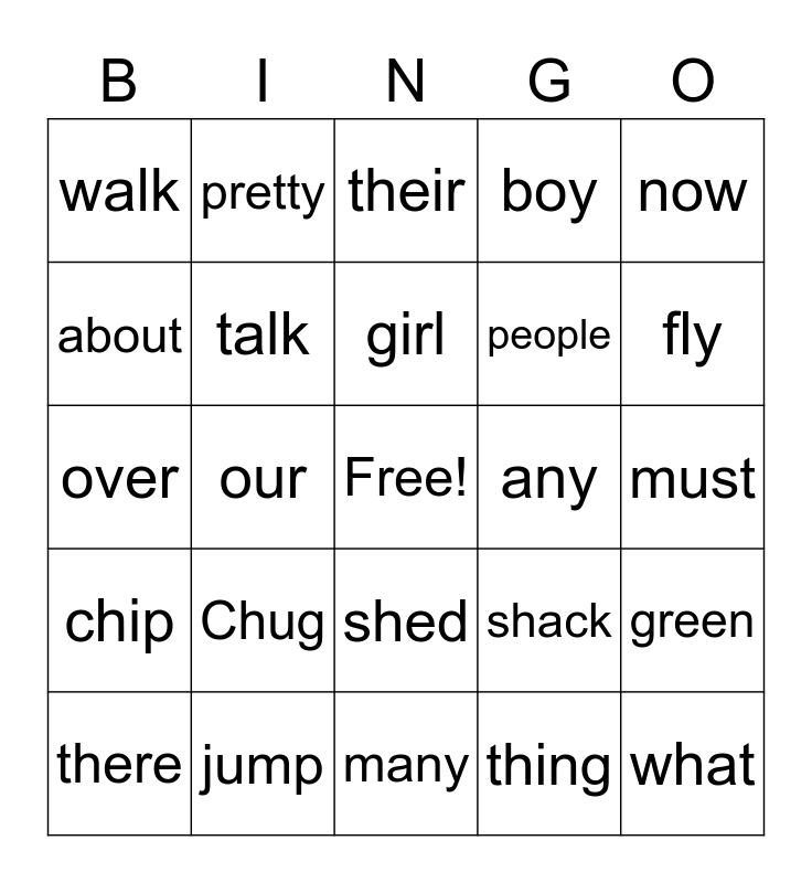 This bingo card has a free space and 24 words: Chug, jump, girl, there, now, walk, about, pretty, any, shed, people, over, shack, green, talk, thing, must, their, fly, our, what, chip, boy and many.