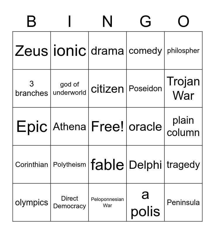 This bingo card has a free space and 24 words: Polytheism, Direct Democracy, citizen, olympics, philospher, Zeus, 3 branches, ionic, oracle, fable, Poseidon, Epic, Delphi, tragedy, god of underworld, a polis, plain column, drama, Trojan War, Athena, Peninsula, Corinthian, comedy and Peloponnesian War.