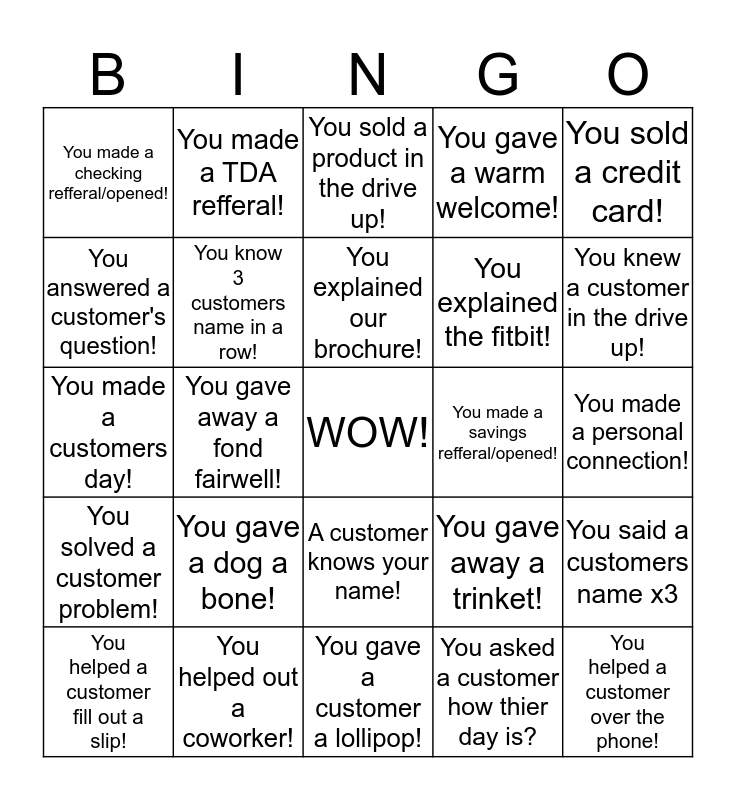 This bingo card has a free space and 24 words: You gave a dog a bone!, You helped out a coworker!, You explained our brochure!, You helped a customer fill out a slip!, You sold a credit card!, You made a checking refferal/opened!, You answered a customer's question!, You made a TDA refferal!, You made a savings refferal/opened!, A customer knows your name!, You explained the fitbit!, You made a customers day!, You gave away a trinket!, You said a customers name x3, You know 3 customers name in a row!, You asked a customer how thier day is?, You made a personal connection!, You sold a product in the drive up!, You knew a customer in the drive up!, You gave away a fond fairwell!, You helped a customer over the phone!, You solved a customer problem!, You gave a warm welcome! and You gave a customer a lollipop!.