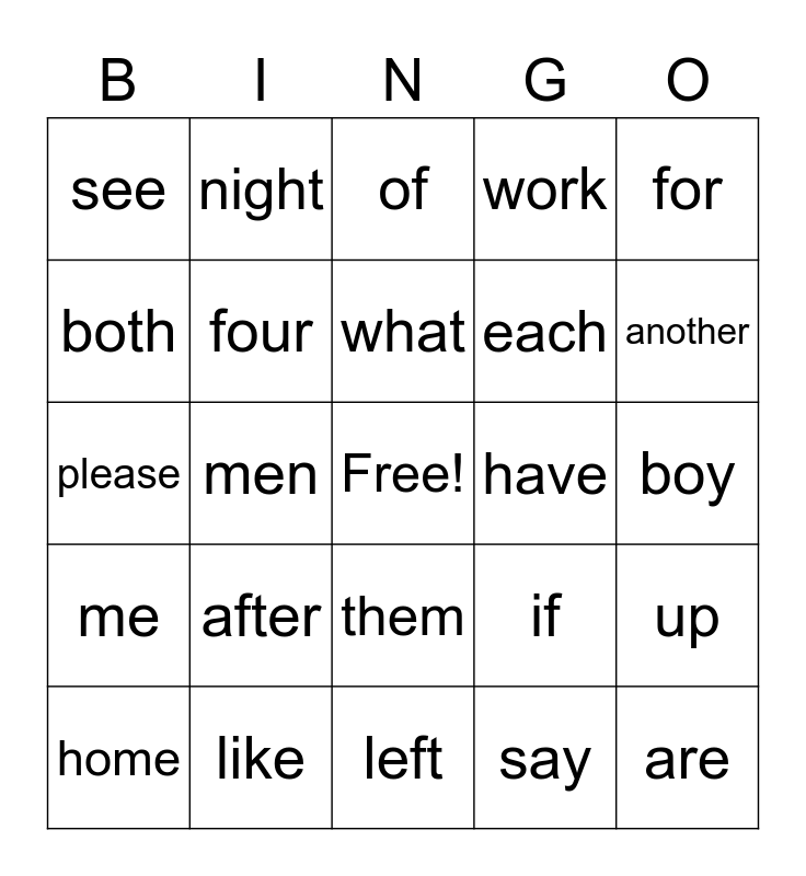 This bingo card has a free space and 24 words: after, like, what, home, for, see, both, night, have, them, each, please, if, up, four, say, boy, of, another, men, are, me, work and left.