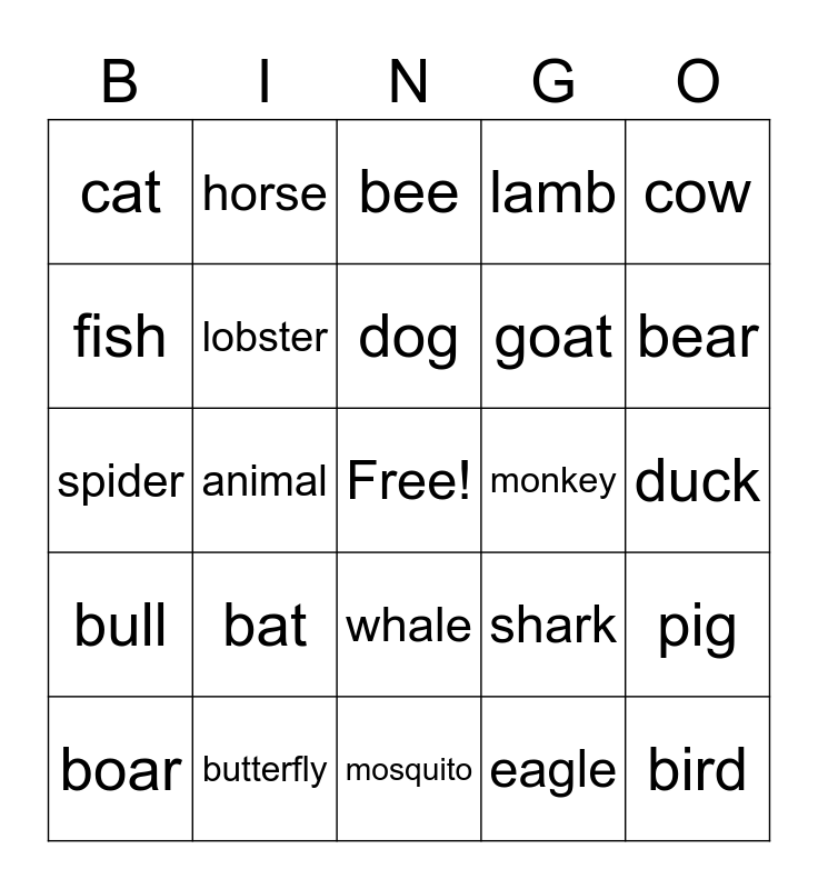 This bingo card has a free space and 24 words: bat, butterfly, dog, boar, cow, cat, fish, horse, monkey, whale, goat, spider, shark, pig, lobster, eagle, duck, bee, bear, animal, bird, bull, lamb and mosquito.