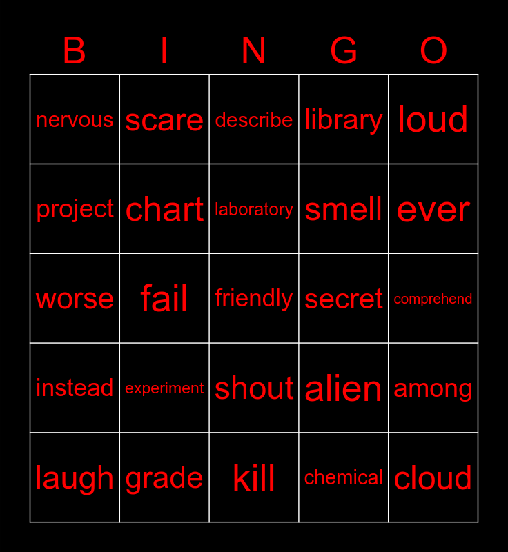This bingo card has 25 words: experiment, kill, laboratory, laugh, loud, nervous, project, scare, secret, shout, smell, worse, alien, among, chart, cloud, comprehend, describe, ever, fail, friendly, grade, instead, library and chemical.