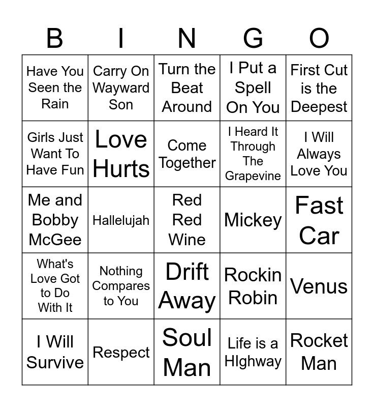 This bingo card has 64 words: I Can't Get no Satisfaction, Abracadabra, American Woman, Venus, Blinded By Light, Knockin' On Heavens Door, Carry On Wayward Son, Cocaine, Come Together, Dirty Diana, Drift Away, Fancy, Fast Car, First Cut is the Deepest, Georgia On My Mind, Girls Just Want To Have Fun, Hallelujah, Have You Seen the Rain, Hound Dog, I Heard It Through The Grapevine, Nothing Compares to You, What's Love Got to Do With It, I Put a Spell On You, I Shot the Sheriff, I Swear, I Think We're Alone Now, Proud Mary, Sweet Dreams (are made of this), Wagon Wheel, Over the Rainbow, Lady Marmalade, Killing Me Softly With His Song, Tennessee Whiskey, I Want Candy, I Will Always Love You, I Will Survive, Jolene, Life is a HIghway, Locomotion, Love Hurts, Me and Bobby McGee, Mickey, mony mony, Blue Suede SHoes, I Love Rock n Roll, Red Red Wine, Respect, Rocket Man, Rockin Robin, Shake a Tail Feather, Simple Man, Smooth Criminal, Soul Man, Spirit in the Sky, Tainted Love, Take Me To The River, Turn the Beat Around, Twist & Shout, Valerie, Walk This Way, Whatta Man, When Doves Cry, You Really Got Me and Your Song.
