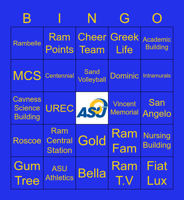 This bingo card has a free space and 54 words: Ram, Roscoe, ASU, Blue, Gold, SGA, Greek Life, Rassman, MCS, Houston Harte University Center, Rambelle, Ram Jam, ASU Athletics, Gum Tree, Homecoming, Bella, Fiat Lux, Dominic, Carr Schlarship, San Angelo, Ram Fam, Alma Mater, Vincent Memorial, Academic Building, Carr Building, Ram Points, The Caf, Spritual Life, Ram Radio, Ram T.V, CHP, Multicultural Center, Christmas Tree lighting, UCPC, Cheer Team, Porter Henderson Library, Cavness Science Building, Nursing Building, Texan Hall, Centennial, Plaza Verde, Robert Massie, Mary Massie, The Rammy's, Ram Central Station, Angelo Serves, Rambunctious Week, Junell Center, Sand Volleyball, UREC, Intramurals, ROTC, Angelettes and Rambassadors.