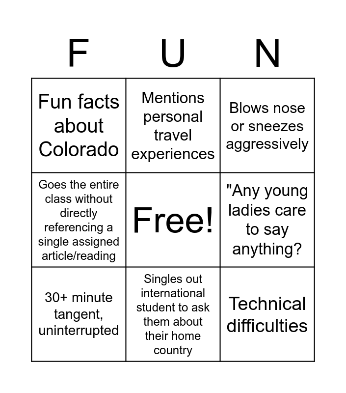 This bingo card has a free space and 8 words: "Any young ladies care to say anything?, Blows nose or sneezes aggressively, Mentions personal travel experiences, 30+ minute tangent, uninterrupted, Fun facts about Colorado, Technical difficulties, Goes the entire class without directly referencing a single assigned article/reading and Singles out international student to ask them about their home country.
