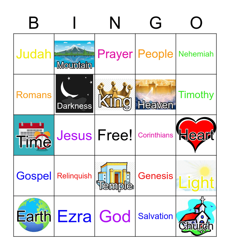 This bingo card has 10 images, a free space and 24 words: Relinquish, Ezra, King, Earth, Nehemiah, Judah, Romans, Mountain, Corinthians, Temple, Heaven, Time, Genesis, Light, Darkness, Salvation, Heart, Prayer, Timothy, Jesus, Church, Gospel, People and God.