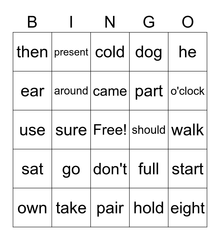 This bingo card has a free space and 24 words: go, take, came, own, he, then, ear, present, should, don't, part, use, full, start, around, hold, walk, cold, o'clock, sure, eight, sat, dog and pair.