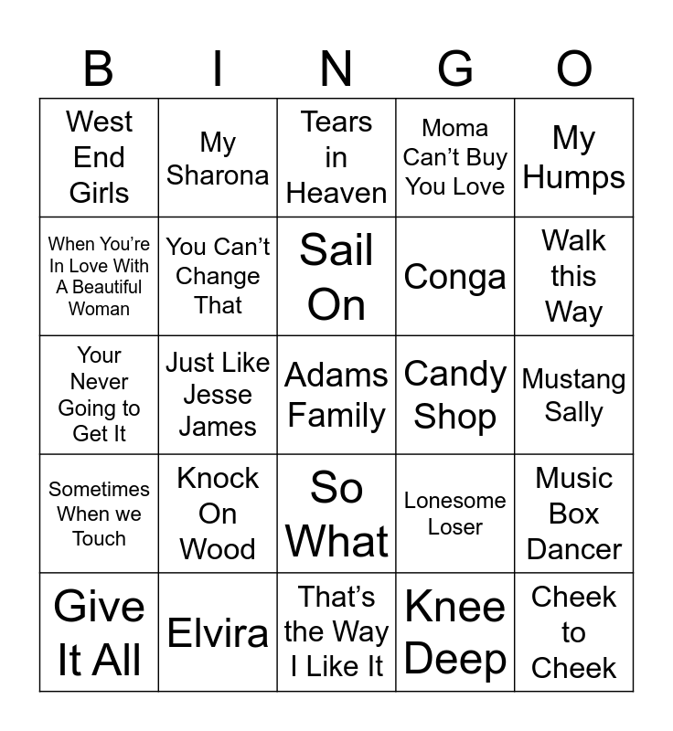 This bingo card has 49 words: Fly Away, Adams Family, Stayin Alive, That’s the Way I Like It, Knock On Wood, Macho Man, My Sharona, Sad Eyes, When You’re In Love With A Beautiful Woman, Heart of Glass, You Can’t Change That, Moma Can’t Buy You Love, Music Box Dancer, Lonesome Loser, Double Vision, Bad Case of Loving You, Sail On, Candy Shop, Don’t Cha, My Humps, Just Like Jesse James, Knee Deep, West End Girls, Conga, ROCK in the USA, Walk this Way, Give It All, Drive By, So What, Sometimes When we Touch, Shut Up & Dance, Sorry, Jose Cuervo, I Told You So, Elvira, I Think I’ll Just Stay Here and Drink, Pain In My Heart, Ms Grace, Mustang Sally, Blame It On The Boogie, Unchained Melody, The Way You Look Tonight, Cheek to Cheek, Life is A Highway, Your Never Going to Get It, Tears in Heaven, Any Man of Mine, The Tide is High and Better Together.