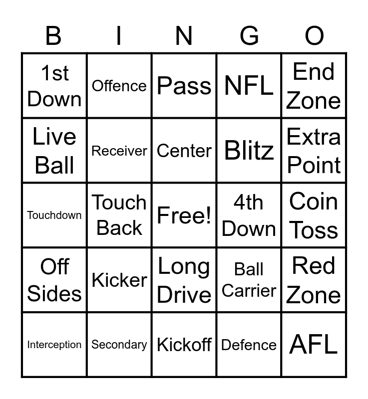 This bingo card has a free space and 37 words: Huddle, Ref, Hand Off, Receiver, Red Zone, Kicker, Center, Too Many Players, End Zone, Spiral, Touch Back, NFL, AFL, Coin Toss, Live Ball, Off Sides, Penalty, Pass, Long Drive, 4th Down, 1st Down, Extra Point, Interception, Kickoff, Line of Scrimmage, Defence, Offence, Return, Rushing, Sack, Safety, Secondary, Touchdown, Audible, Ball Carrier, Blitz and Bubble Screen.