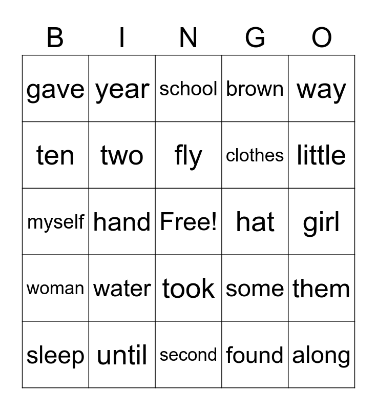 This bingo card has a free space and 24 words: water, until, fly, sleep, way, gave, ten, year, hat, took, clothes, myself, some, them, two, found, girl, school, little, hand, along, woman, brown and second.