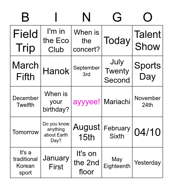 This bingo card has a free space and 24 words: Do you know anything about Earth Day?, January First, September 3rd, It's a traditional Korean sport, Talent Show, Field Trip, March Fifth, I'm in the Eco Club, Mariachi, August 15th, July Twenty Second, December Twelfth, February Sixth, 04/10, Hanok, May Eighteenth, November 24th, When is the concert?, Sports Day, When is your birthday?, Yesterday, Tomorrow, Today and It's on the 2nd floor.