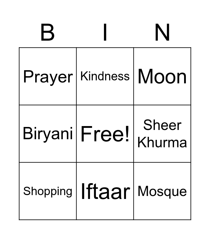 This bingo card has a free space and 23 words: Eid, Ramadan, Iftaar, Sehri, Mosque, Prayer, Sheer Khurma, Kindness, Charity, Zakt, New Clothes, Henna, Lanterns, 30 days, Call a friend, Donate food, Moon, Celebration, Shopping, Dates, Biryani, Sweets and Fasting.