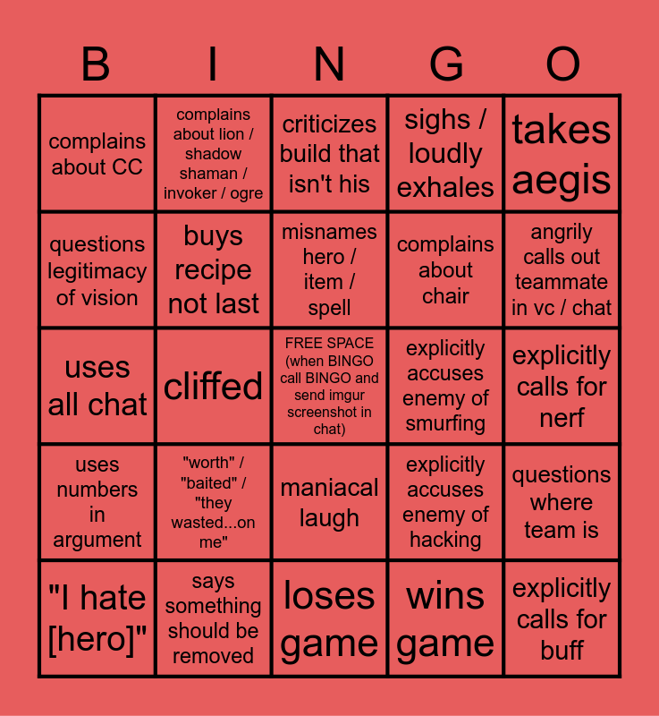 This bingo card has a free space and 31 words: loses game, sings / hums, cliffed, facepalms / hits self, complains about CC, criticizes build that isn't his, buys recipe not last, explicitly accuses enemy of hacking, explicitly accuses enemy of smurfing, wins game, explicitly calls for nerf, explicitly calls for buff, screams / roars / grunts, 10+ deaths, angrily calls out teammate in vc / chat, "WAT"(sounds like a duck), questions where team is, "worth" / "baited" / "they wasted...on me", uses numbers in argument, maniacal laugh, takes aegis, involved with / is first blood, "I hate [hero]", complains about lion / shadow shaman / invoker / ogre, complains about chair, questions legitimacy of vision, sighs / loudly exhales, uses all chat, says something should be removed, misnames hero / item / spell and "didn't think / expect" / "i thought".