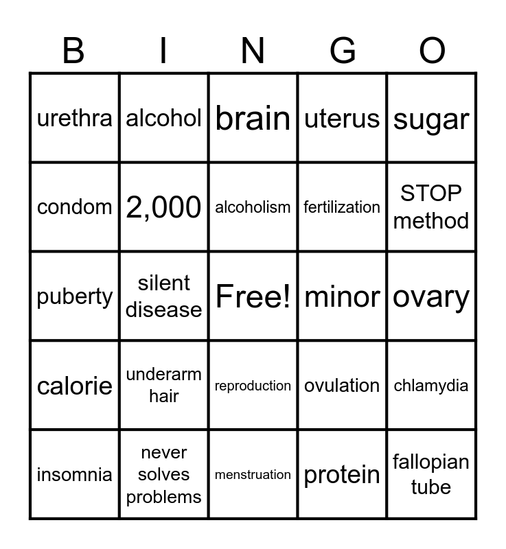 This bingo card has a free space and 34 words: nutrients, protein, calcium, water, calorie, 2,000, sugar, insomnia, alcohol, cirrhosis, alcoholism, brain, poor judgement, binge drinking, minor, STOP method, never solves problems, puberty, underarm hair, ovulation, reproduction, sperm, urethra, ovary, menstruation, fallopian tube, uterus, abstinence, fertilization, condom, STI, silent disease, chlamydia and HIV.