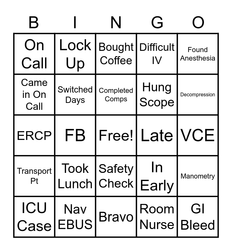 This bingo card has a free space and 24 words: Took Lunch, Nav EBUS, Completed Comps, ICU Case, Found Anesthesia, On Call, Came in On Call, Lock Up, Late, Safety Check, Hung Scope, ERCP, In Early, Manometry, Switched Days, Room Nurse, VCE, Bought Coffee, Decompression, FB, GI Bleed, Transport Pt, Difficult IV and Bravo.