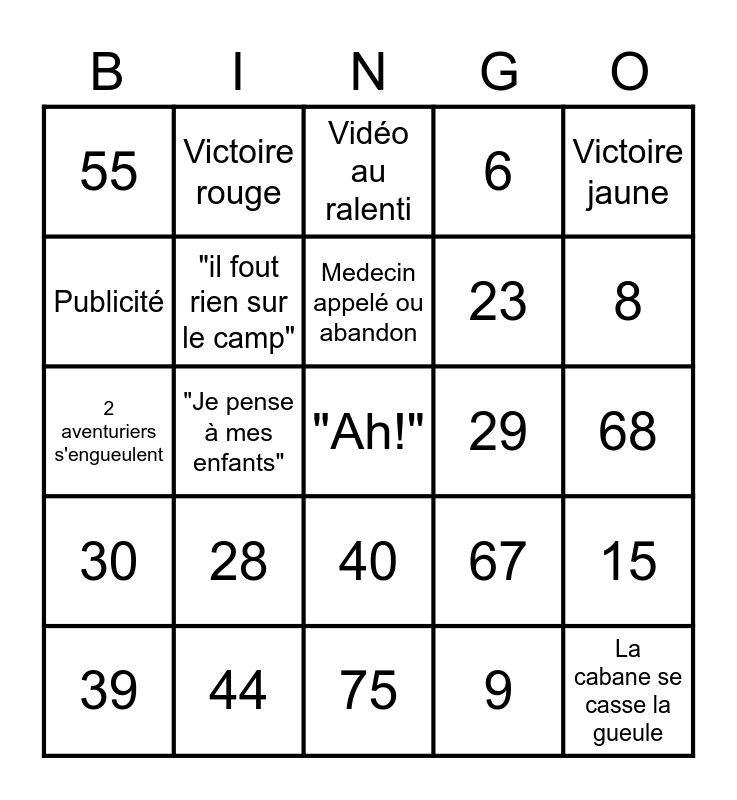 This bingo card has a free space and 75 words: Poisson pêché, Complot pour en éliminer un, Vidéo au ralenti, Les filles complotent contre les mecs (ou inverse), Flashback présentation aventurier, "Moi je suis là pour gagner", Le radeau coule, Chiale parce que c'est trop dur, Conseil surprise, Gueule après son élimination, Tirage au sort boule noire avant épreuve, Collier trouvé, Medecin appelé ou abandon, Publicité, N'arrive pas à (re)lancer le feu, "Je pense à mes enfants", Le connard ou connasse est éliminé, La cabane se casse la gueule, "On n'a plus de riz", Victoire jaune, Ramène du manioc, 2 aventuriers s'engueulent, "il fout rien sur le camp", Victoire rouge, 6, 21, 35, 51, 66, 7, 22, 36, 52, 67, 8, 23, 37, 53, 68, 9, 24, 38, 54, 69, 10, 25, 39, 55, 70, 11, 26, 40, 56, 71, 12, 27, 41, 57, 72, 13, 28, 42, 58, 73, 14, 29, 43, 59, 74, 15, 30, 44, 60, 75 and 45.