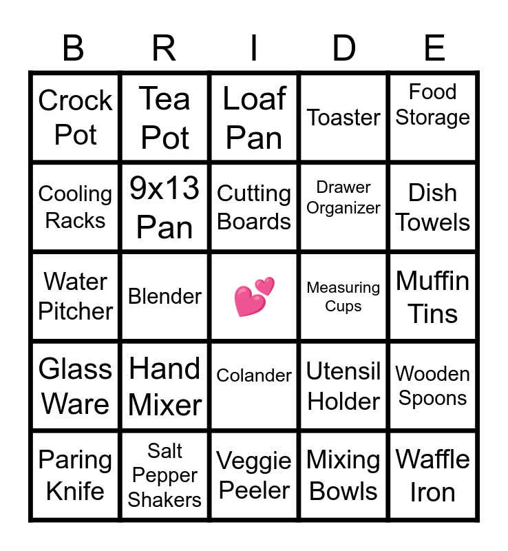 This bingo card has a free space and 37 words: Cookie Sheets, Rolling Pin, Dish Cloths, 9x13 Pan, Wooden Spoons, Hand Mixer, Cutting Boards, Pizza Cutter, Food Storage, Can Opener, Blender, Toaster, Waffle Iron, Muffin Tins, Cooling Racks, Glass Ware, Silver Ware, Loaf Pan, Colander, Measuring Cups, Crock Pot, Dish Towels, Paring Knife, Veggie Peeler, Wire Whisk, Mixing Bowls, Tea Pot, Pot Holders, Bundt Pan, Cake Carrier, Casserole Dish, Salt Pepper Shakers, Water Pitcher, Coffee Maker, Utensil Holder, Drawer Organizer and Pots and Pans.