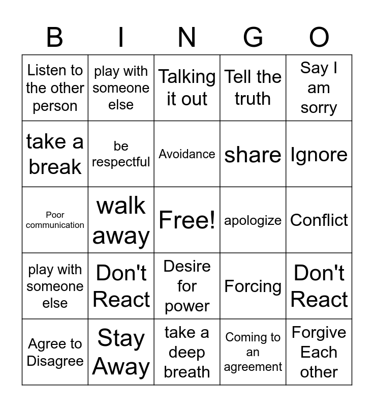 This bingo card has a free space and 32 words: Coming to an agreement, take turns, walk away, acknowledge your feelings, play with someone else, be respectful, Say I am sorry, Don't React, play with someone else, ask for help, Avoidance, Talking it out, Compromise, Collaboration, apologize, Free, Agree to Disagree, Poor communication, Desire for power, Don't React, Forcing, Work out the problem, Conflict, Stay Away, Forgive Each other, Tell the truth, share, take a break, Listen to the other person, take a deep breath, use kind words and Ignore.