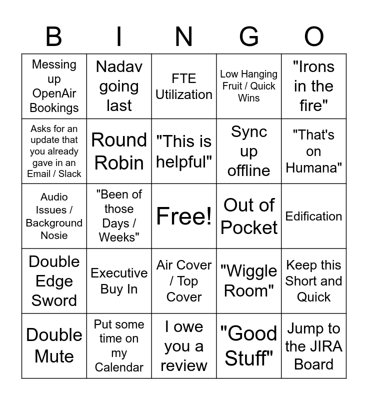 This bingo card has a free space and 28 words: Keep this Short and Quick, "Forest for the Trees", Sync up offline, "Good Stuff", Asks for an update that you already gave in an Email / Slack, FTE Utilization, Nadav going last, Double Edge Sword, Out of Pocket, Double Mute, Audio Issues / Background Nosie, Low Hanging Fruit / Quick Wins, Put some time on my Calendar, I owe you a review, "That's on Humana", Quorum, Executive Buy In, Round Robin, "This is helpful", Air Cover / Top Cover, Messing up OpenAir Bookings, Calling a Model a CDA / Vice Versa, Jump to the JIRA Board, "Been of those Days / Weeks", Edification, "Wiggle Room", "Irons in the fire" and Placeholder.