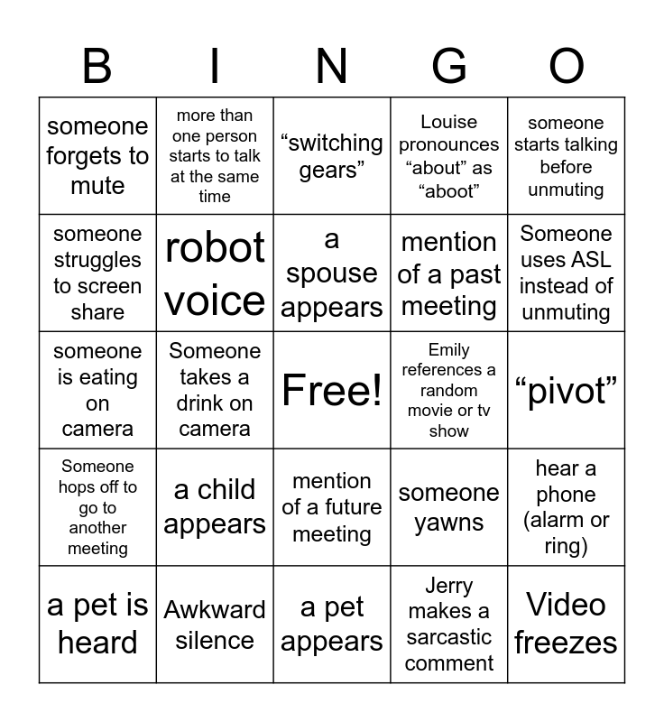 This bingo card has a free space and 25 words: a child appears, a pet appears, a spouse appears, a pet is heard, someone starts talking before unmuting, someone forgets to mute, someone struggles to screen share, more than one person starts to talk at the same time, Emily references a random movie or tv show, mention of a future meeting, mention of a past meeting, someone is eating on camera, someone yawns, hear a phone (alarm or ring), robot voice, someone is wearing a mask, “pivot”, “switching gears”, Someone uses ASL instead of unmuting, Someone takes a drink on camera, Video freezes, Awkward silence, Someone hops off to go to another meeting, Louise pronounces “about” as “aboot” and Jerry makes a sarcastic comment.