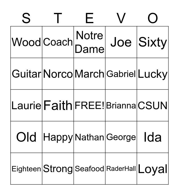 This bingo card has a free space and 24 words: Happy, Strong, March, Eighteen, Sixty, Wood, Guitar, Coach, Brianna, Nathan, Gabriel, Laurie, George, Ida, Norco, RaderHall, CSUN, Notre Dame, Lucky, Faith, Loyal, Old, Joe and Seafood.