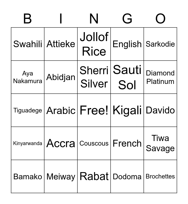 This bingo card has a free space and 29 words: Bamako, Mogadishu, Arabic, Somali, Swahili, Jollof Rice, Abidjan, Accra, Kigali, Meiway, Davido, Brochettes, Rabat, Dodoma, Diamond Platinum, Ugali, Couscous, Kinyarwanda, Sarkodie, Tiguadege, French, Twi, Sauti Sol, Aya Nakamura, English, Attieke, Tiwa Savage, Sherri Silver and Kwabena Kwabena.