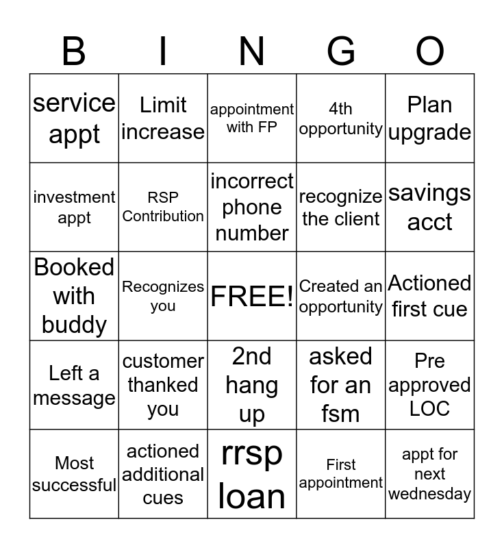 This bingo card has a free space and 32 words: First appointment, TFSA, Recognizes you, Hang up, Left a message, RSP Contribution, Plan upgrade, Pre approved LOC, Limit increase, Additional Mastercard, incorrect phone number, appointment with FP, Dog barking in the back, 3rd appointment, Created an opportunity, First to complete calls, Most successful, Booked with buddy, 2nd hang up, customer thanked you, asked for an fsm, booked at another branch, Actioned first cue, actioned additional cues, appt for next wednesday, 4th opportunity, recognize the client, investment appt, service appt, rrsp loan, Primary chequing and savings acct.