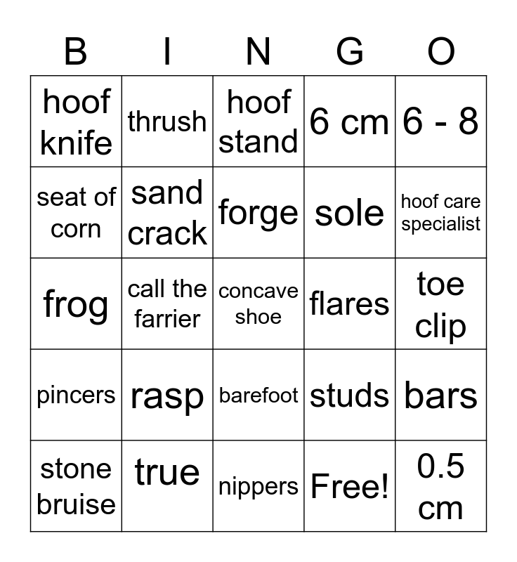 This bingo card has 30 words: true, false, call the farrier, grass crack, hoof knife, hoof stand, sand crack, barefoot, flares, nippers, toe clip, concave shoe, Free!, 0.5 cm, hoof care specialist, quarter clips, studs, pincers, rasp, 6 - 8, frog, hot shoeing, thrush, sole, seat of corn, 6 cm, bars, stone bruise, forge and coronary band.