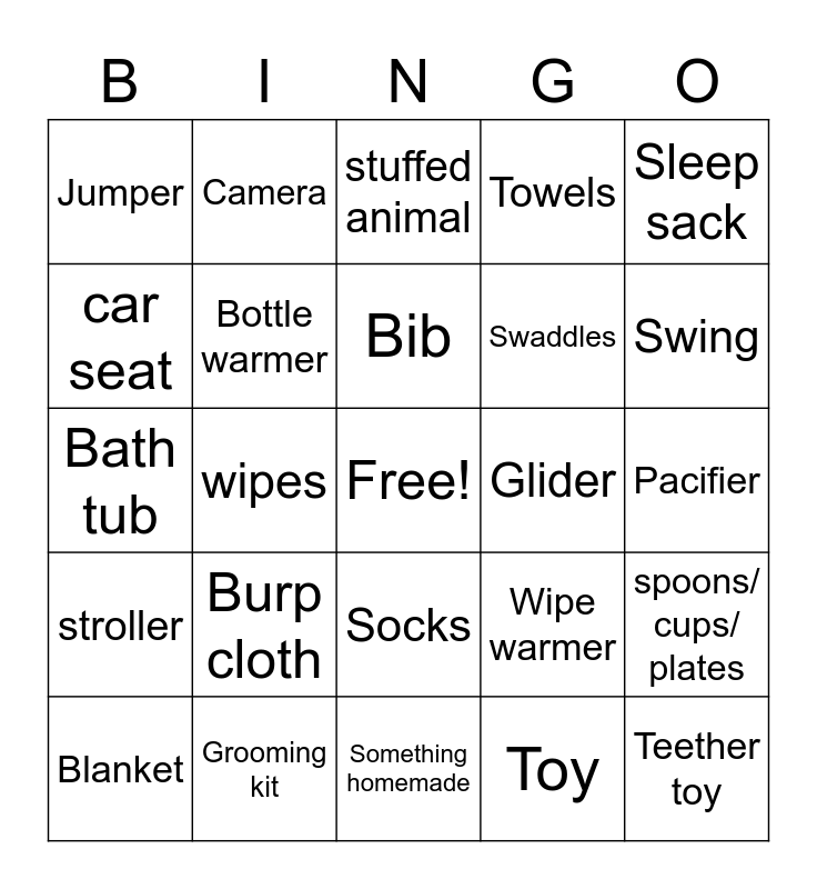 This bingo card has a free space and 50 words: Wash cloths, Teether toy, Book, Something homemade, Burp cloth, Mittens, Camera, Baby carrier/ sling, car seat, Crib/ bassinet, Bottle warmer, Towels, spoons/ cups/ plates, Wipe warmer, tops, Lotion, Bib, Glider, bottle, Sleep sack, wipes, Toy, Jumper, Swaddles, On theme - greenery/ floral, Photo album, Swing, Nursing pillow, stuffed animal, Socks, Diaper bag, Activity mat, Changing pads, Thermometer, Grooming kit, Hat, Gift card, Pants, Something unique, Pacifier, Crib sheets, Changing table top, Pajamas, Onesies, Blanket, Bath tub, Baby monitor, Diapers, stroller and Soap.