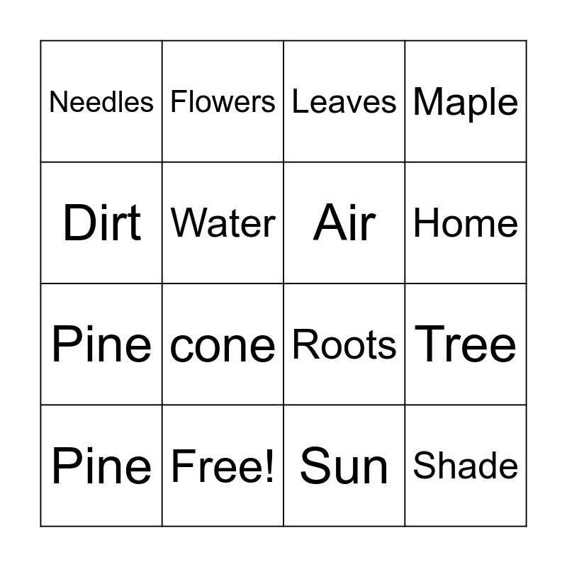 This bingo card has 16 words: Free!, Tree, Leaves, Needles, Pine, Flowers, Roots, Sun, Dirt, Water, Pine, Maple, cone, Home, Air and Shade.