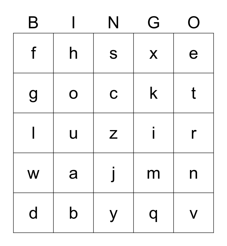This bingo card has a free space and 24 words: a, b, c, d, e, f, g, h, i, j, k, l, m, n, o, q, r, s, t, u, v, w, x and y.