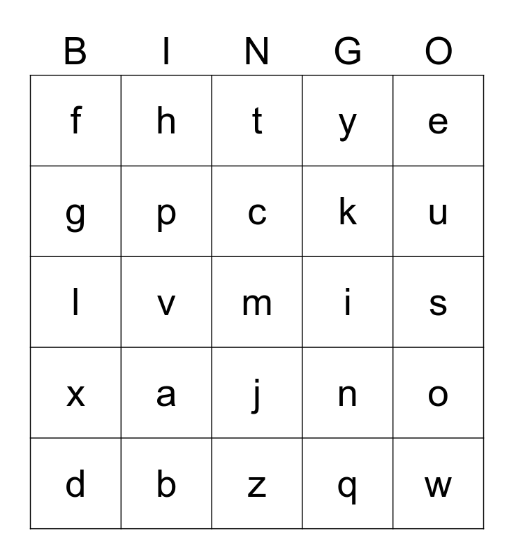 This bingo card has a free space and 24 words: a, b, c, d, e, f, g, h, i, j, k, l, n, o, p, q, s, t, u, v, w, x, y and z.