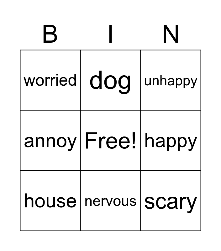 This bingo card has a free space and 8 words: happy, unhappy, dog, house, worried, scary, annoy and nervous.