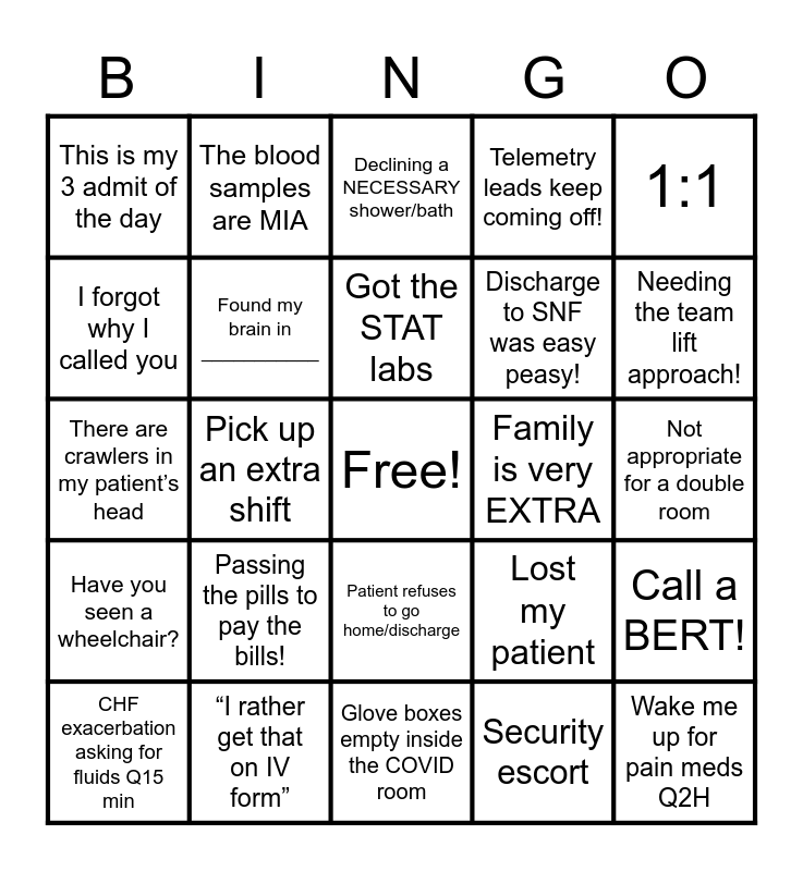 This bingo card has a free space and 57 words: Waiting for meds for >2 hours, CHF exacerbation asking for fluids Q15 min, Admission arrived screaming from the ED, This is my 3 admit of the day, Glove boxes empty inside the COVID room, Lost my brain, Found my brain in ___________, A coworker bought you coffee, Discharge to SNF was easy peasy!, Family calling >6 times within 8 hours, Telemetry leads keep coming off!, Arrythmia? NO, leads fell off, Working with your favorite HCA, Lost pen, Pen MIA, >400 lbs of responsibilities in a single room, 1:1, Pick up an extra shift, Serial caller, Wake me up for pain meds Q2H, Family is very EXTRA, No PRN available in the Narc cabinet, Lost my patient, Declining a NECESSARY shower/bath, Got the IV in, Got the STAT labs, STAT labs ordered for 3 hours from order, Can you bring down the pt to X-ray, Yes the one that was ordered for bedside, Needing the team lift approach!, CODE + BERT + RRT, CODE x2 within my shift, Rowdy and uncompliant left AMA, My admission arrived DURING shift change, This friend needs to be rotated, Not appropriate for a double room, I forgot why I called you, D/C foley and push 60 mg of Lasix, There are crawlers in my patient’s head, Have you seen the bladder scanner?, Have you seen a wheelchair?, The blood samples are MIA, Patient refuses to go home/discharge, Straight outta NIGHT shift!, Salty like 0.9% NS, “made a difference”, RN does not stand for Refreshments and Narcotics, Passing the pills to pay the bills!, “I rather get that on IV form”, Patient called 9-1-1, Pain 12/10, Busted ostomy at the beginning of the shift, Security escort, Narcan STAT, Fire drill, Hemolyzed specimen, Call a BERT! and Compressions are my cardio!.