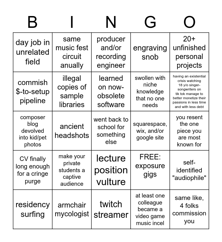 This bingo card has 25 words: make your private students a captive audience, twitch streamer, learned on now-obsolete software, residency surfing, 20+ unfinished personal projects, day job in unrelated field, commish $-to-setup pipeline, same music fest circuit anually, squarespace, wix, and/or google site, lecture position vulture, swollen with niche knowledge that no one needs, composer blog devolved into kid/pet photos, FREE: exposure gigs, self-identified "audiophile", illegal copies of sample libraries, same like, 4 folks commission you, you resent the one piece you are most known for, producer and/or recording engineer, having an existential crisis watching 18 y/o singer-songwriters on tik tok manage to better monetize their passions in less time and with less debt, ancient headshots, went back to school for something else, armchair mycologist, CV finally long enough for a cringe purge, engraving snob and at least one colleague became a video game music incel.