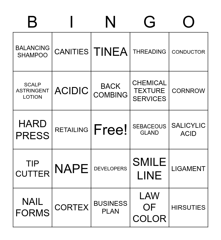 This bingo card has a free space and 33 words: PATCH TEST, FILLERS, RETAILING, SEMI PERMANENT HAIR COLOR, TIP CUTTER, ACIDIC, CONDUCTOR, NAIL FORMS, CANITIES, MASCARA, BACK COMBING, TINEA, LUNULA, PEDICURE, SEBACEOUS GLAND, CORNROW, CORTEX, HARD PRESS, NAPE, SMILE LINE, DEVELOPERS, SOFT WATER, BALANCING SHAMPOO, SALICYLIC ACID, BUSINESS PLAN, HIRSUTIES, THREADING, CHEMICAL TEXTURE SERVICES, SCALP ASTRINGENT LOTION, LIGAMENT, CUTICLE, LAW OF COLOR and PERIONYCHIUM.