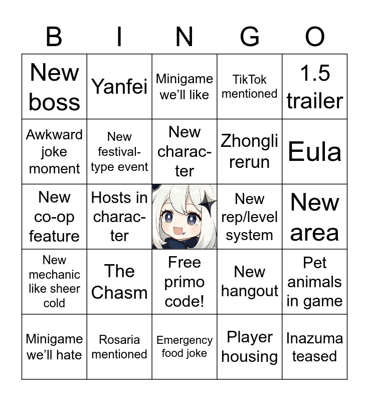This bingo card has a free space and 24 words: The Chasm, Rosaria mentioned, New charac- ter, Minigame we’ll hate, 1.5 trailer, New boss, Awkward joke moment, Yanfei, New rep/level system, Free primo code!, Zhongli rerun, New co-op feature, New hangout, Pet animals in game, New festival- type event, Player housing, New area, Minigame we’ll like, Eula, Hosts in charac-ter, Inazuma teased, New mechanic like sheer cold, TikTok mentioned and Emergency food joke.