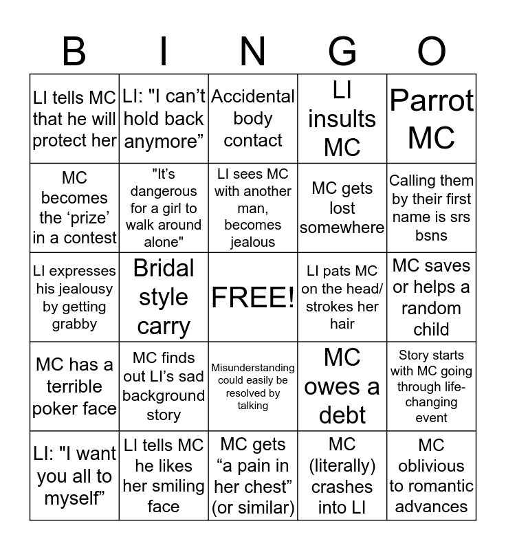 This bingo card has a free space and 75 words: Indirect kiss, Accidental kiss, Accidental body contact, Forced kiss on MC, Fainting or swooning from shock, Collapsing from overwork, MC gets sick with fever, Nursing back to health, Forced to share a room or bed, Caught in the rain together, Drying each other’s hair, Kidnapping, LI sees MC with another man, becomes jealous, MC becomes the ‘prize’ in a contest, MC trips/ falls, Bridal style carry, MC worries LI will detect her pounding heart, MC oblivious to romantic advances, MC misinterprets LI’s romantic advances, Parrot MC, MC: “Huh?”, LI expresses his jealousy by getting grabby, "It’s dangerous for a girl to walk around alone", LI: "I can’t hold back anymore”, LI insults MC, LI calls MC cute, Watching him/ her sleep, Holding hands is srs bsns, Making an excuse to hold hands, MC notices LI’s ‘manly’ physical attributes, MC and LI are hiding/ stuck in a cramped space, MC becomes scared and clings to LI, LI cockblocks himself, MC owes a debt, Calling them by their first name is srs bsns, MC gets lost somewhere, Lap napping, MC does something self-sacrificing, MC saves or helps a random child, MC (literally) crashes into LI, MC has trouble identifying her feelings as attraction, Evil or unpleasant people are ugly, LI drags MC somewhere with no explanation, LI breaking up with MC “for her sake”, MC: "I'm a burden to him, I should leave", MC: "I'm not good enough for him”, LI: "I want you all to myself”, LI tells MC that he will protect her, Stockholm syndrome, MC and LI get matching things, LI rests his head on MC’s shoulder, Misunderstanding could easily be resolved by talking, LI: “stay by my side”/ “let’s be together forever”, LI keeps a secret from MC for her sake, MC worries that LI will see her blushing, Something dramatic happens in the rain, LI clings to MC while asleep, MC is carried to bed by LI, MC finds herself staring at LI, MC freaks out from seeing LI shirtless, MC finds out LI’s sad background story, LI wipes away MC’s tears, LI likes to tease MC, Stuttering MC, LI carries stuff for MC/ helps reach high things, LI pats MC on the head/ strokes her hair, LI embraces MC suddenly, MC is compared to an animal, MC’s physical weakness against men is pointed out, Story starts with MC going through life-changing event, MC has a terrible poker face, LI tells MC he likes her smiling face, Everyone but MC and LI can tell that they love each other, MC gets “a pain in her chest” (or similar) and LI: “I’m not the right man for you”.