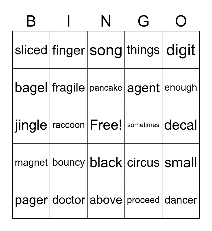 This bingo card has a free space and 24 words: bouncy, doctor, pancake, pager, digit, sliced, bagel, finger, sometimes, black, agent, jingle, circus, small, fragile, proceed, decal, song, enough, raccoon, dancer, magnet, things and above.
