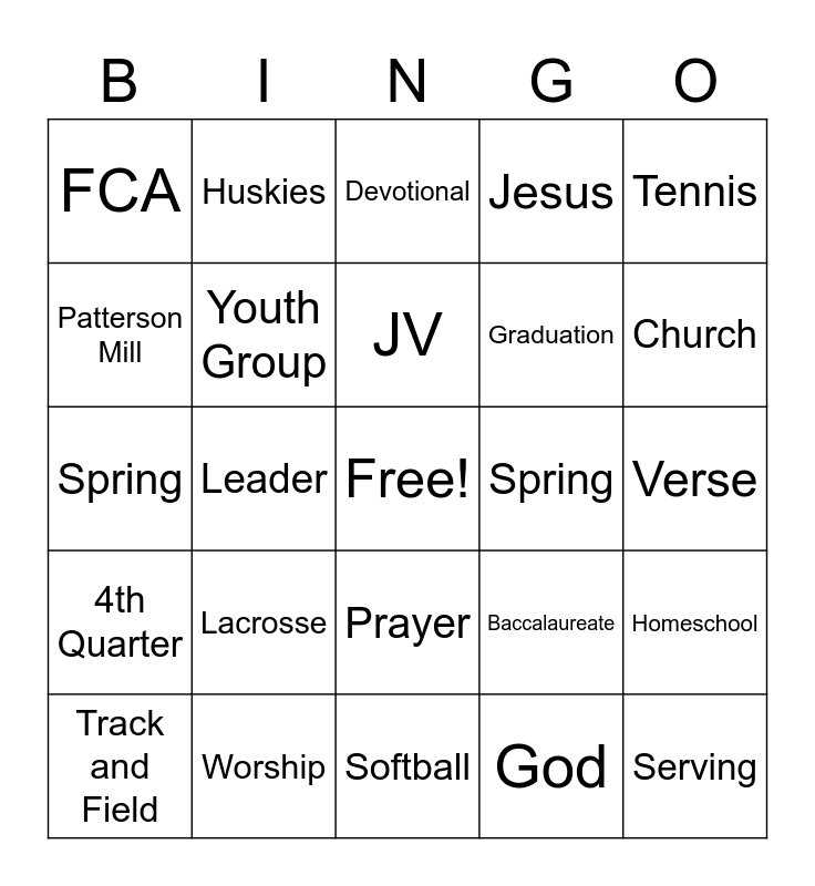 This bingo card has a free space and 25 words: Lacrosse, Softball, JV, Track and Field, Tennis, FCA, Patterson Mill, Huskies, Spring, Prayer, Graduation, Spring, Baccalaureate, Homeschool, Youth Group, Bible, Verse, Devotional, Church, Leader, Serving, Worship, 4th Quarter, Jesus and God.