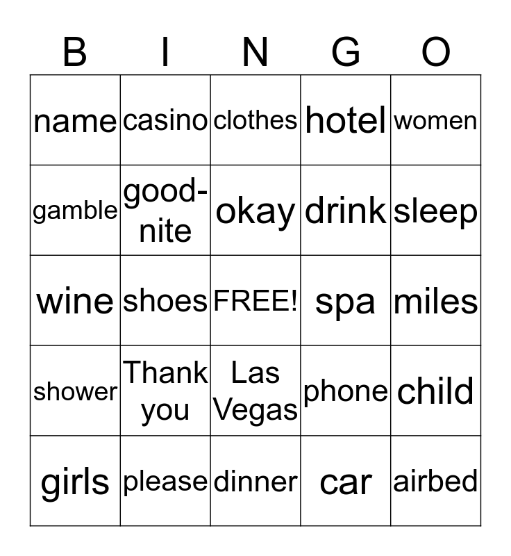 This bingo card has a free space and 24 words: Thank you, please, okay, girls, women, name, gamble, casino, spa, Las Vegas, drink, wine, phone, child, good-nite, car, miles, clothes, sleep, shoes, airbed, shower, hotel and dinner.