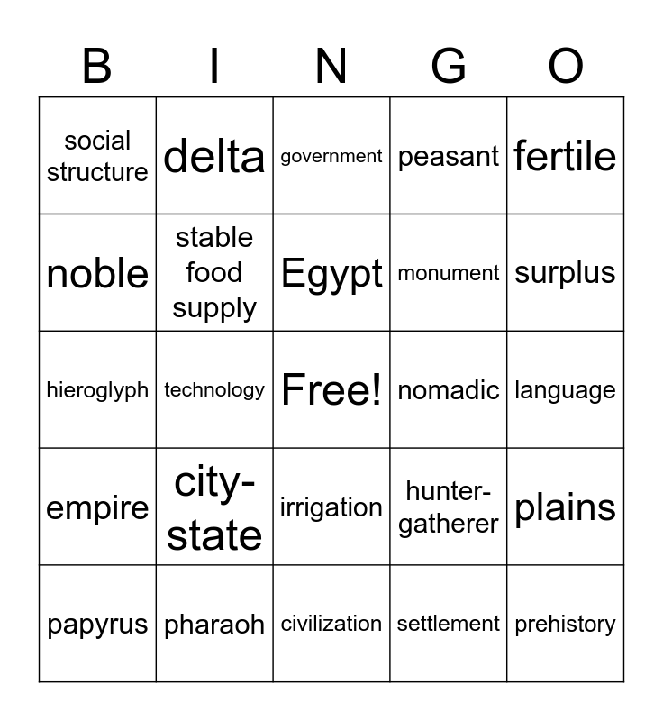 This bingo card has a free space and 31 words: civilization, art, technology, religion, social structure, government, stable food supply, hunter-gatherer, nomadic, settlement, language, prehistory, culture, Mesopotamia, surplus, scarcity, plains, city-state, empire, irrigation, fertile, levee, papyrus, delta, monument, noble, peasant, hieroglyph, pharaoh, Egypt and Kush.