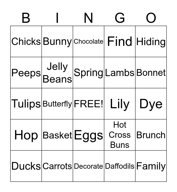 This bingo card has a free space and 24 words: Basket, Carrots, Spring, Ducks, Hiding, Chicks, Peeps, Bunny, Lily, Eggs, Lambs, Tulips, Hot Cross Buns, Brunch, Jelly Beans, Daffodils, Dye, Chocolate, Bonnet, Butterfly, Family, Hop, Find and Decorate.