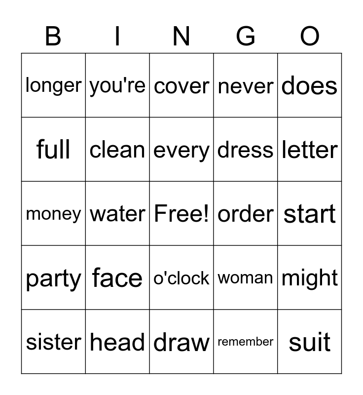 This bingo card has a free space and 24 words: face, head, every, sister, does, longer, full, you're, order, o'clock, dress, money, woman, might, clean, remember, start, cover, letter, water, suit, party, never and draw.